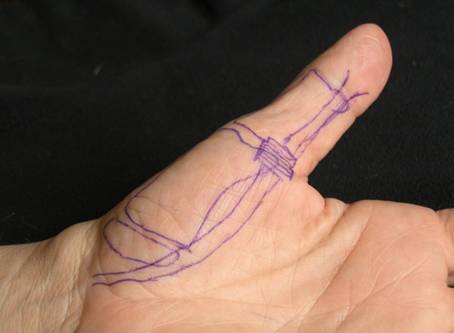Considero este dato muy importante: en el momento de explorar y en el de de tratar ( ya sea fisioterapéuticamente como al infiltrar). En un próximo blog explicaré cómo infiltro los dedos en resorte.