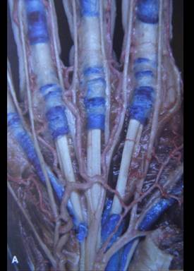 La siguiente preparación anatómica muestra las poleas flexoras teñidas de azul ( A!; A2, A3 en dedos trifalángicos; vaina flexora independente de pulgar y meñique)