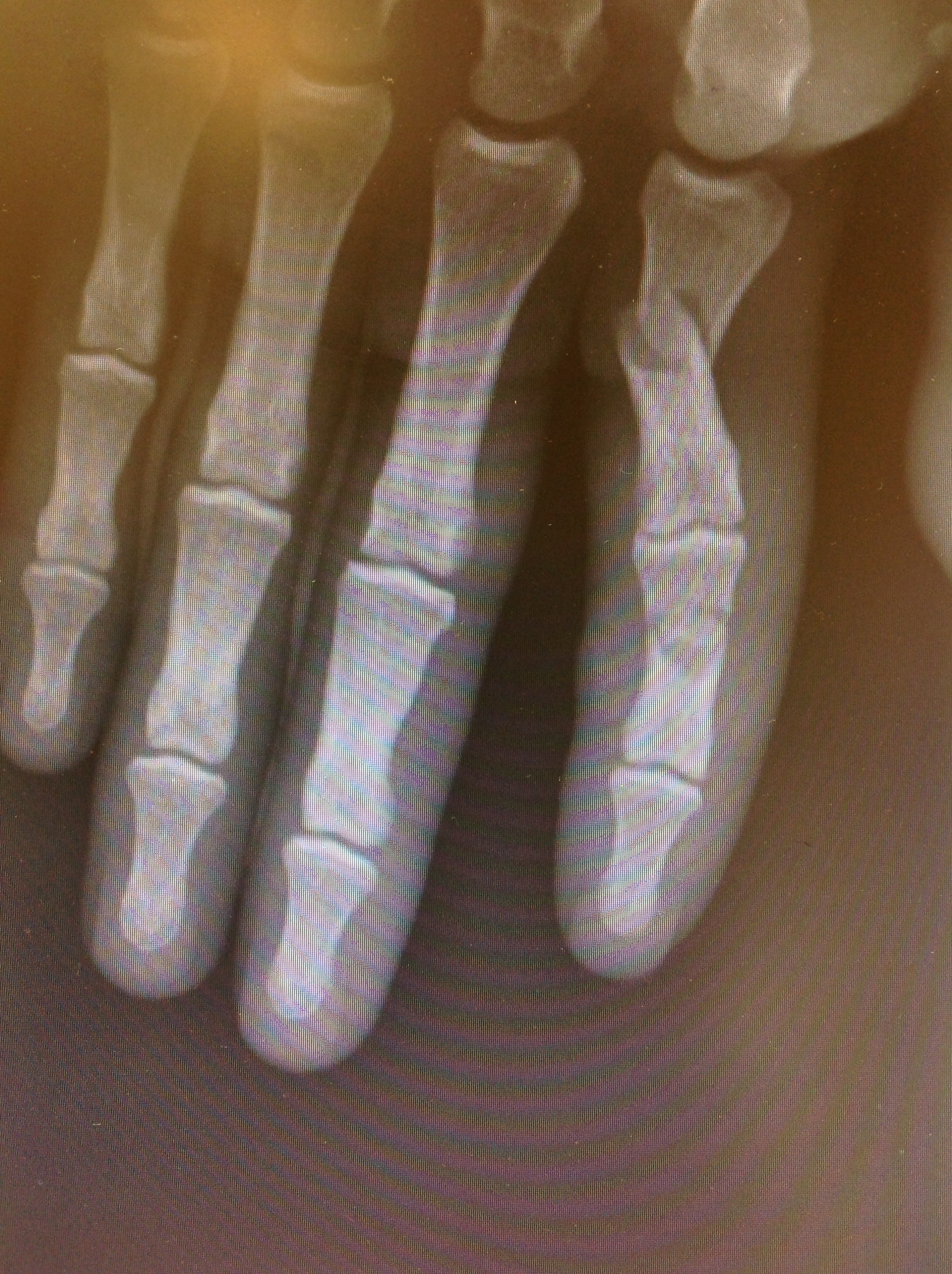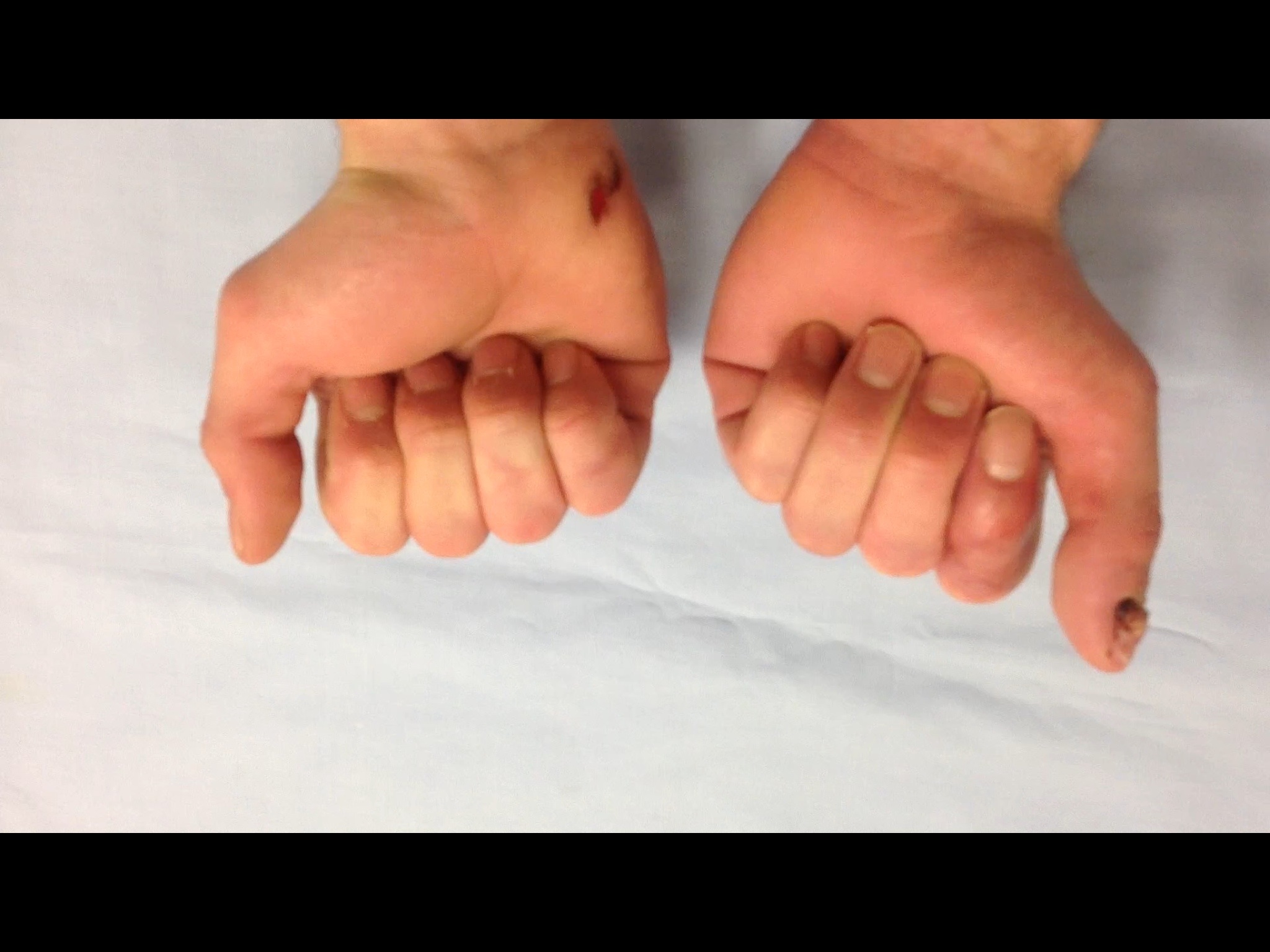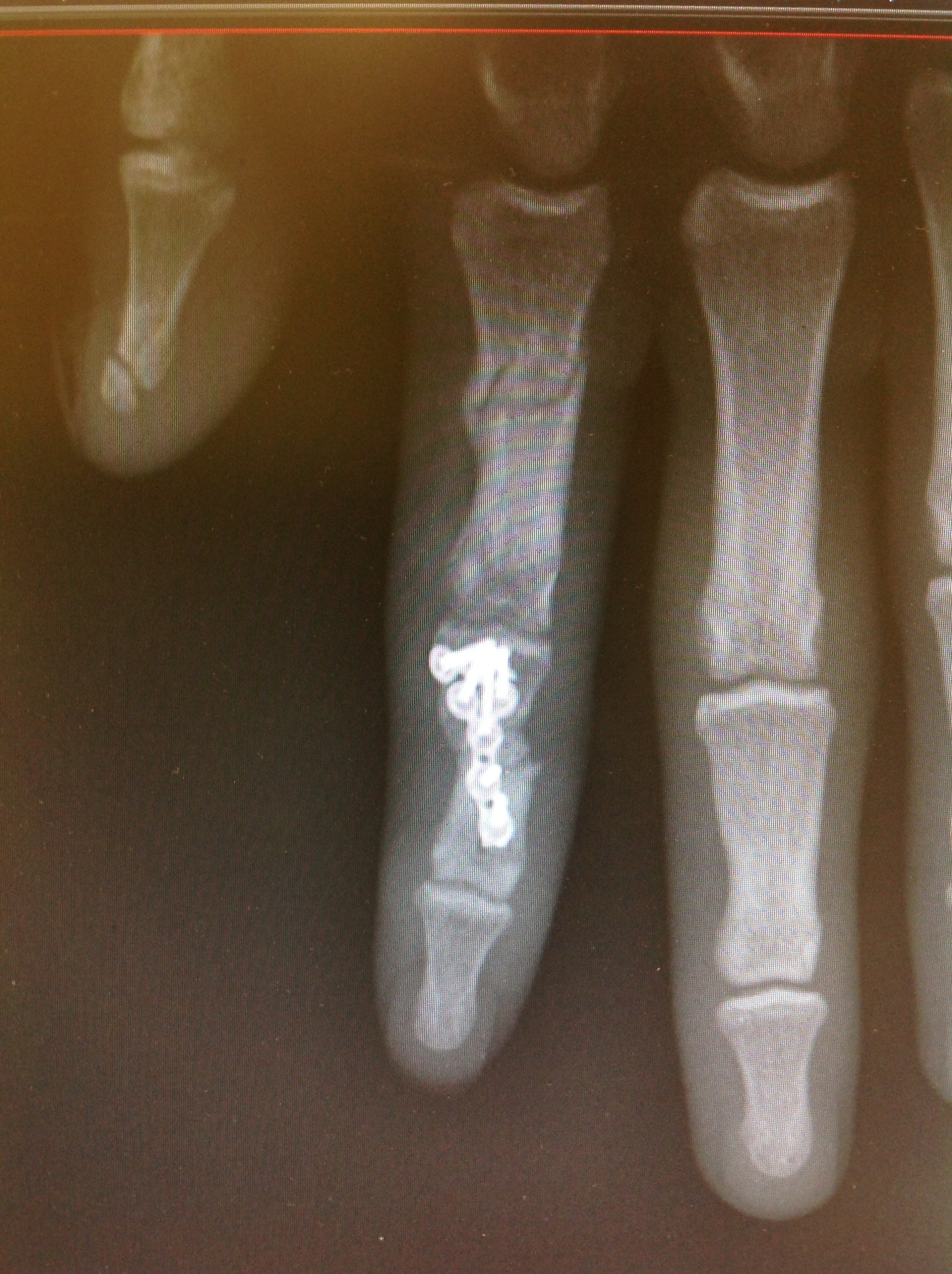Paciente d 19 años que ingresó en nuestro centro afecto de Fractura de F2 del pulgar, fractura transversa de la F1 del índice, fractura conminuta de la F2 del índice con afectación del aparato extensor al mismo nivel.